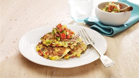 - Divide salsa between plates and serve with a stack of 3 fritters each.