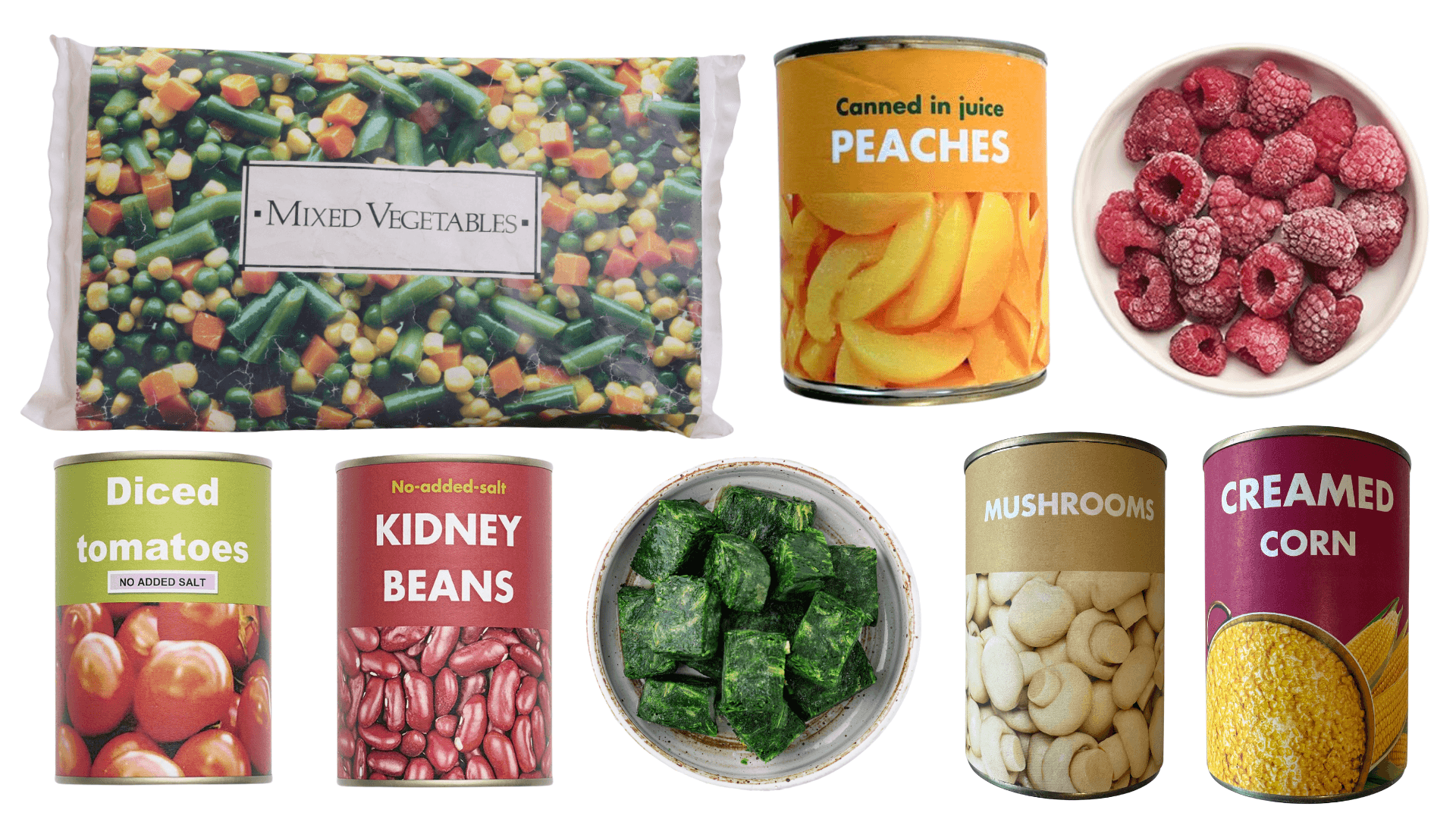 Frozen and canned fruit veg are a great option if you like the idea of eating more produce but struggle to find the time and energy for cooking. Frozen and canned varieties are often pre-chopped and ready to add into your dish, meaning less preparation time and cleaning. They also have a much longer shelf life (yay for less food waste!) and are often cheaper than fresh fruit and veg.